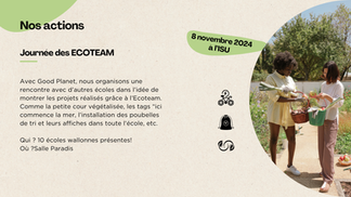 Goodplanet est l’organisme qui coordonne les Eco-team dans les écoles et leur propose différentes actions à mettre en place pour réduire les déchets, manger plus sainement, mieux gérer l’énergie et plein d’autres choses encore.